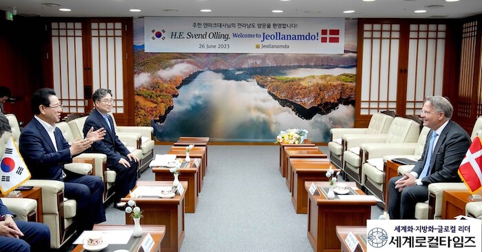 [세계로컬타임즈 김명진 기자] 전라남도는 26일 도청 접견실에서 김영록 도지사와 스벤 올링(Svend olling) 주한덴마크 대사가 전남 해상풍력발전단지 적기 건설과 지역 일자리 창출 등을 위한 협력 방안을 심도있게 논의했다고 밝혔다. 이번 면담은 지난 5월 취임한 스벤 올링 대사가 면담을 요청해 이뤄졌다.
