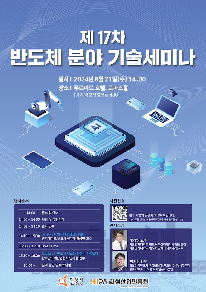 ‘제17차 반도체 분야 기술세미나’에 관한 자세한 정보와 참가 신청 방법은 화성산업진흥원 기업지원플랫폼에서 확인 가능하며, 포스터 내 QR코드를 통해서도 신청할 수 있다.
