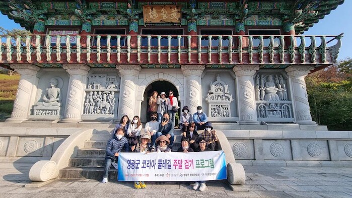 | ▲영광군 코리아둘레길 주말 걷기 프로그램 중 백제불교최초도래지에서 기념촬영모습. (사진=영광군 제공) |