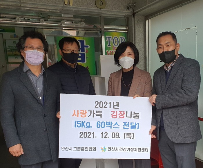 [세계로컬타임즈 김상우 기자] 안산시건강가정지원센터는 안산시그룹홈연합회로부터 저소득 취약가정의 따뜻한 겨울나기를 위한 김장김치 60박스(박스당 5㎏)를 기탁 받았다고 12일 밝혔다.