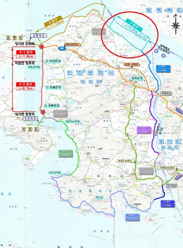 강화읍 대산리~양사면 철산리 구간 5.5km(왕복2차로)를 연결하는 2공구는 지난 2011년 7월 행정안전부의 ‘접경지역 발전종합계획’에 반영된 이후 2015년 7월에 착공해 사업비 392억(국비 274억, 시비 118억) 원을 투입했다.