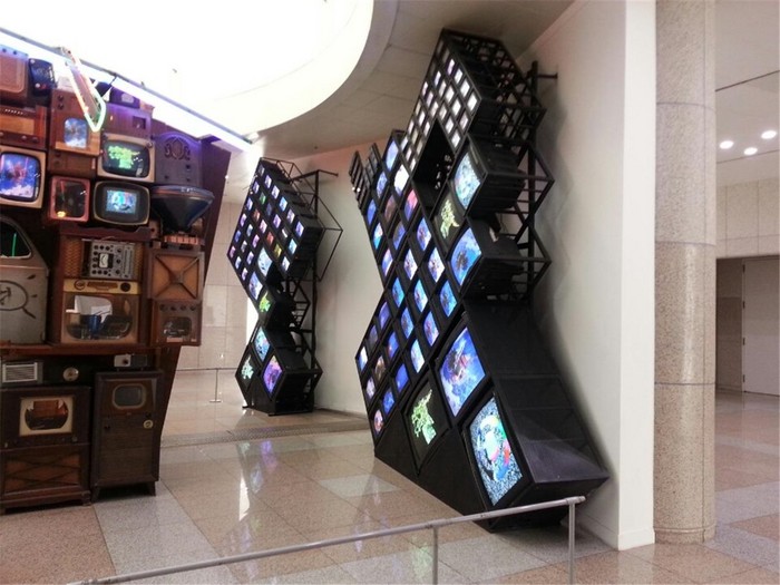 ‘프랙탈 거북선’은 총 348대의 낡은 텔레비전, 전화기, 축음기, 카메라, 라디오, 박제거북 등을 비롯해 자동차와 피아노 등을 연출, 사람의 눈이 인지할 수 없는 속도로 빠르게 변화하는 역동적인 영상이 어우러진 백 작가의 대표작품.