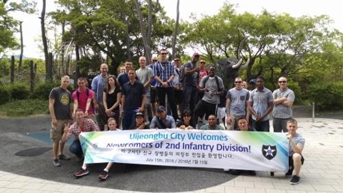 | ▲ 의정부시가 15일 미 2사단 신규 전입 장병들을 대상으로 시티투어를 진행하면서 단체로 기념촬영하고 있다.<사진제공=의정부시청> |