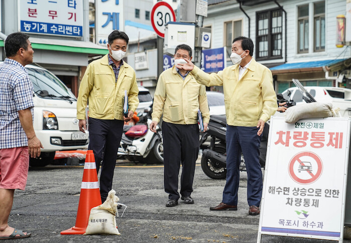 [세계로컬타임즈 김명진 기자] 목포시 만호동 일원이 지난 13~14일 해수면 상승(14일 최고 5.33m)으로 인해 침수돼 상가(목포광주약국~갑자옥모자점)로 해수가 유입됨에 따라 박홍률 목포시장이 14일 오전 현장을 방문해 피해 상황을 살펴보고, 수습 상황을 점검했다.