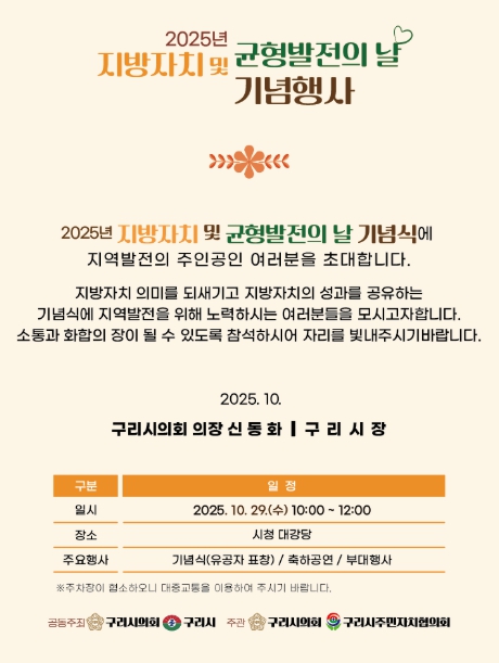 올해 개최되는 지방자치 및 균형발전의 날 기념식은 구리시의회와 구리시와 지방자치의 양 수레바퀴로서 공동주최하고, 구리시주민자치협의회가 공동주관하여 지역주민의 적극적인 참여와 소통으로 진행된다.