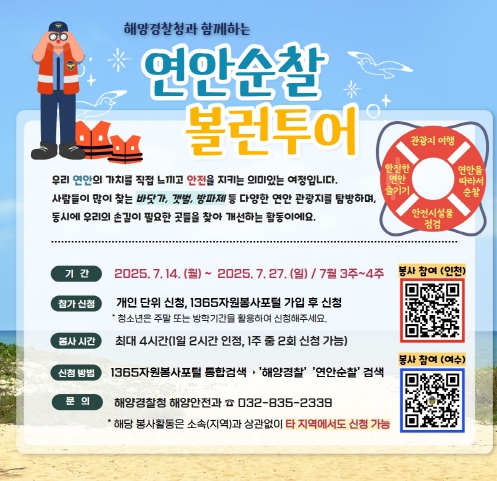 이번 활동은 연안안전 점검주간인 7월 3주부터 2주간(7.14.~7.27.) 진행되며, 타 지역에서도 참여 신청이 가능하다. 참여를 원하는 개인 또는 가족은 해양경찰청 누리집 또는 1365자원봉사 누리집을 통해 신청할 수 있다.