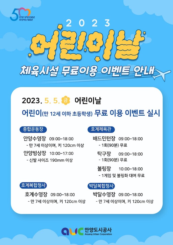 ▲안양도시공사 어린이날 체육시설 무료 이용 안내문.(사진=안양도시공사)