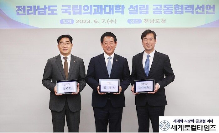 [세계로컬타임즈 김명진 기자] 전라남도는 7일 도청 귀빈실에서 국립 목포대·순천대와 함께 도민 의료여건 개선과 지역소멸 위기 극복을 위한 전남도 국립 의과대학 설립에 공동 협력키로 선언했다.