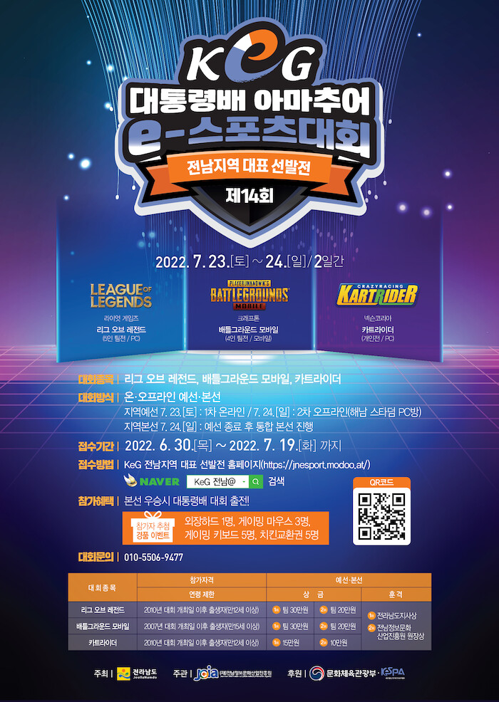 이인용 전남정보문화산업진흥원장은 “2020년 열린 대통령배 아마추어 e스포츠 대회 카트라이더 종목에서 전남 대표선수로 참가해 우승한 김정제 선수는 현재 프로팀에 입단해 활발하게 활동하는 등 이 대회가 프로게이머 등용문으로 주목받고 있다”며, “이번 대회에서도 좋은 성과를 함께할 지역 e스포츠동호인의 많은 관심과 참여를 바란다”고 말했다.