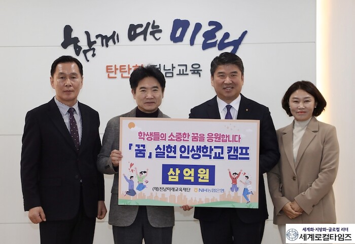 [세계로컬타임즈 김명진 기자] 전남미래교육재단이 27일 NH농협은행 전남본부로부터 3억 원의 특별한 ‘장학기금’을 전달받아 ‘꿈 실현금’과 ‘꿈 실현 인생학교’라는 새로운 형태의 장학사업을 시작한다.