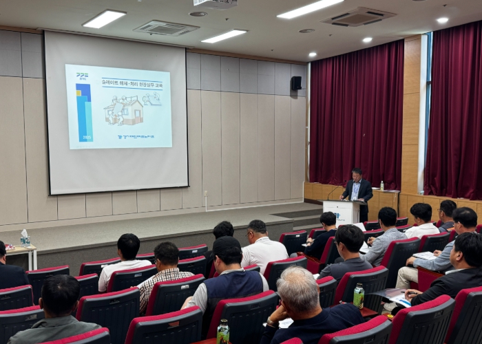 이번 교육은 슬레이트 철거 현장의 안전성과 행정 투명성을 높이기 위한 일환으로 마련됐으며, 실무자들의 법령 이해도 향상과 현장 대응 역량 강화를 목표로 구성됐다. 특히 ▲면적조사 기준 ▲해체 절차 ▲폐기물 처리 등 핵심 실무 내용은 물론 ▲혹서기 안전관리 ▲감염병 예방 ▲민원 대응 방안까지 폭넓게 다루며 체계적인 현장 운영관리가 이뤄질 수 있도록 했다.
