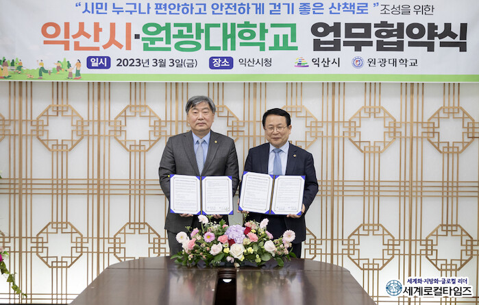 4일 익산시에 따르면 정헌율 익산시장과 박성태 원광대 총장이 지난 3일 자연식물원, 원대병원, 캠퍼스를 잇는 산책로 조성 협약을 맺었다.