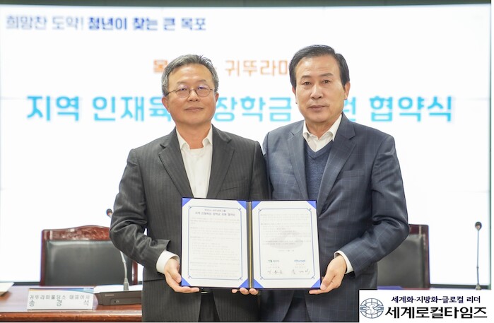 협약식에는 박홍률 목포시장과 송경석 ㈜귀뚜라미홀딩스 대표가 참석했고, 귀뚜라미그룹은 목포시 취약계층에 장학금 5천만 원을 지원하기로 했다.