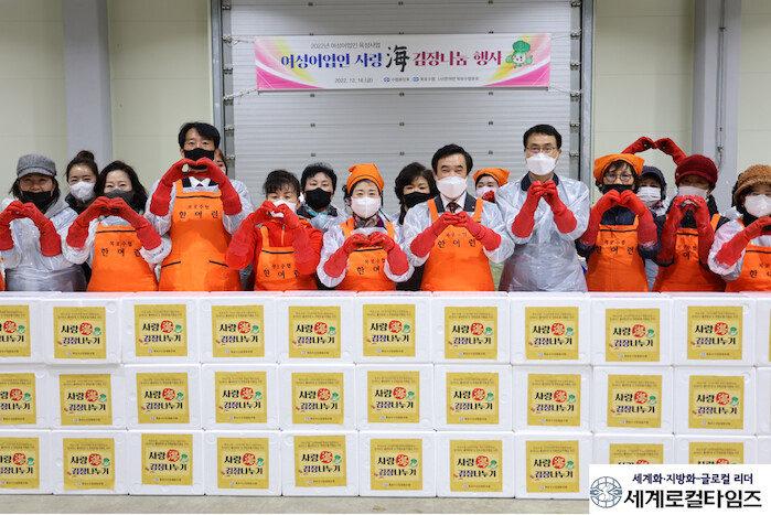 [세계로컬타임즈 김명진 기자] 전남 목포수협 임직원과 목포수협 한여련분회 회원들이 지난 16일 목포수협 서남권수산종합지원단지 위판장에서 이웃을 위한 사랑海 김장김치 나눔행사를 개최했다.