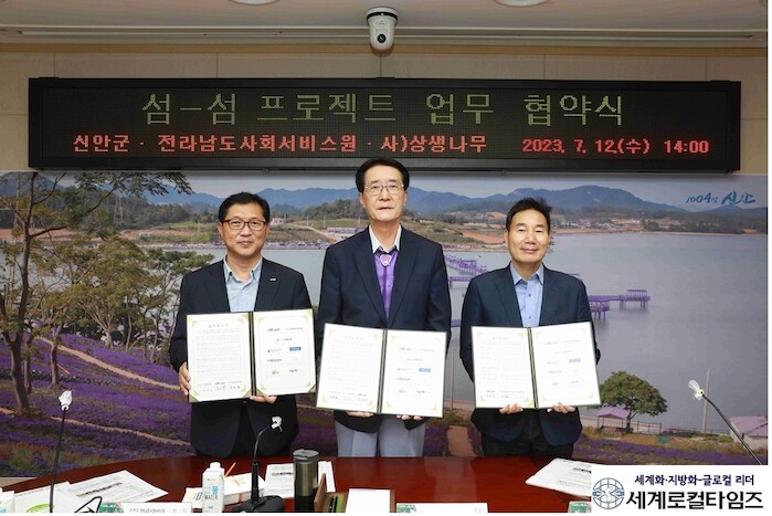 [세계로컬타임즈 김명진 기자] 신안군은 12일 도서지역 맞춤형 사회서비스 제공을 위한 ‘섬-섬(Service Union Model) 프로젝트’의 원활한 추진을 위해 전라남도사회서비스원, 사단법인 상생나무와 업무협약을 체결했다고 전했다.