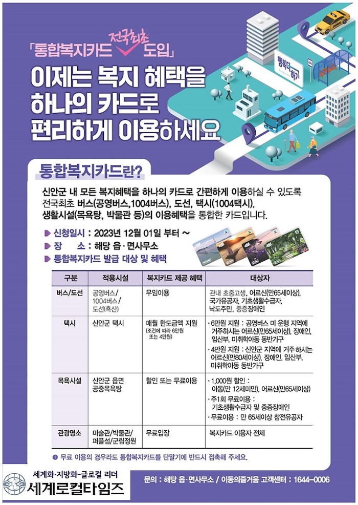 [세계로컬타임즈 김명진 기자] 신안군은 오는 12월 1일 관내 분야별로 분산된 복지 혜택을 하나로 통합하고 이용자의 편의를 개선한 통합복지플랫폼 ‘행복 더하기 통합복지카드’ 서비스를 오픈한다고 밝혔다.