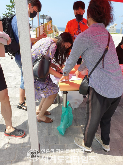 | ▲대천해수욕장에서 진행된 '반려동물 문화조성' 캠페인에서 서명을 하고 있다. (사진=보령시 제공) |