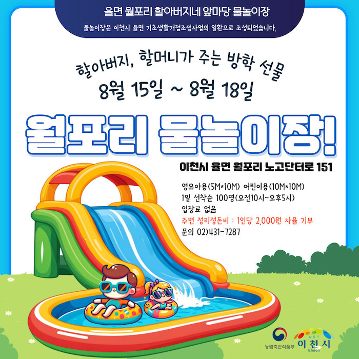 율면 월포리 ‘어린이 물놀이장’은 경기도 최초로 농림축산식품부와 이천시가 농촌협약을 체결하여 추진 중인 율면 기초생활거점 조성 사업의 일환으로 기획되었다.