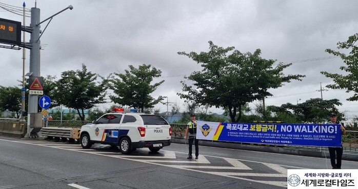 ▲보행금지 현수막 목포대교 설치 장면(사진=목포해경) |
