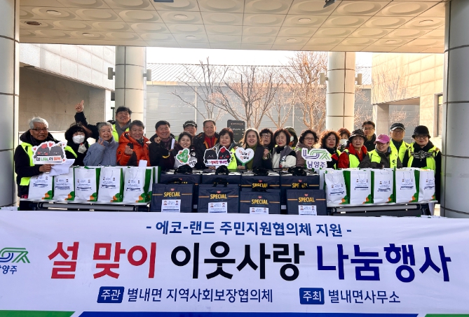 전달된 명절 꾸러미는 △에코-랜드 주변지역 주민지원협의체 주민지원사업 기금으로 마련한 명절 식품세트 △별내면 이장협의회가 후원한 떡국 떡 2kg △개인 후원자 고근형·이수옥 님이 기부한 사골곰탕 1.5kg 등으로 구성됐다. 이번 나눔은 지역사회 각계의 정성을 모아 준비해 더욱 뜻깊다.
