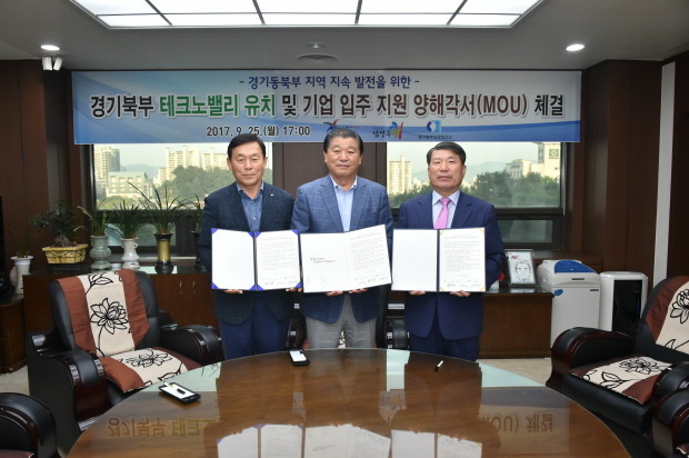 [세계로컬신문 고성철 기자] 경기도 구리시(시장 백경현)와 남양주시(시장 이석우)는 25일 구리시장실에서 경기동부상공회의소(회장 명제태)와 경기북부 2차 테크노밸리 조성사업의 성공적 유치를 위한 업무협약(MOU)을 체결했다.