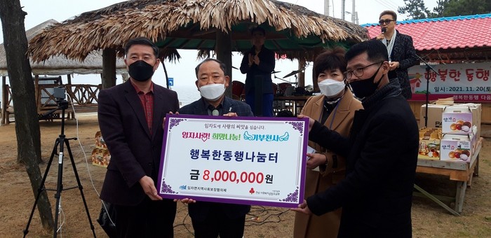 | ▲ 신안군 임자면지역사회보장협의체는 행복한 동행 나눔터로부터 성금을 기탁 받았다.(사진=신안군) |
