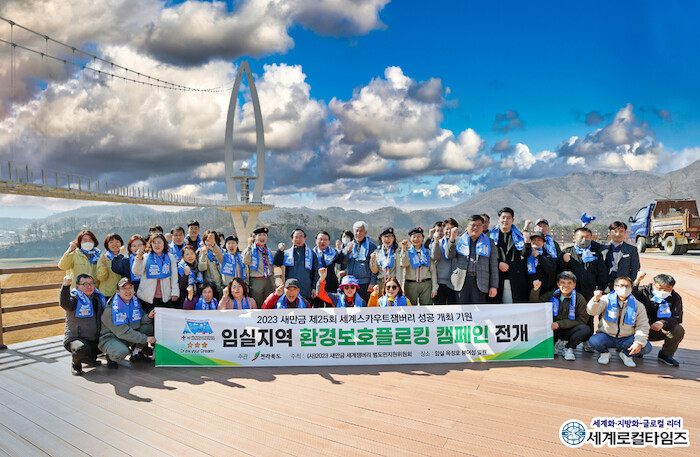 [세계로컬타임즈 조주연 기자] 전북 임실군과 2023 새만금 세계스카우트잼버리 범도민지원위원회가 2023 새만금 세계잼버리 성공 개최를 기원하며 임실 옥정호 붕어섬 출렁다리 일원에서 ‘그린 잼버리 실천 캠페인’을 전개했다.