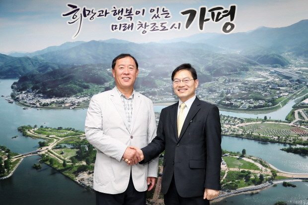 | ▲김성기 가평군수(왼쪽)가 23일 군수실에서 나정균 한강유역환경청장을 만나 악수하고 있다.<사진제공=가평군청> |