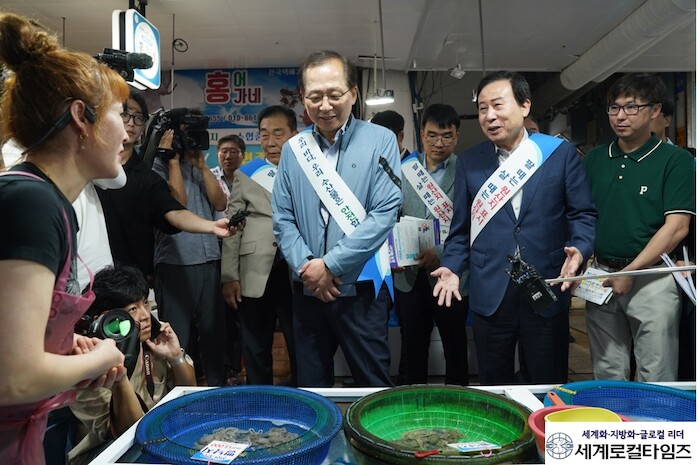 ▲박홍률(사진 오른쪽)목포시장은 조승환 해양수산부 장관과 수산물 안전관리 현장점검을 진행했다. (사진=목포시) |