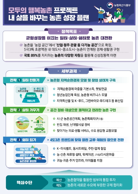시·군은 농촌공간계획을 지역 발전의 ‘지도(地圖)’로 삼아, 주거·융복합산업·경관 등을 기능별로 구획하고 농촌특화지구를 지정·육성하게 된다. 이를 통해, 주거환경 보호와 함께 생산 관련 시설 집적에 따른 생산 효율화 등을 기대할 수 있다. 현재 농촌지역 139개 시·군은 정주여건 개선 및 경제 활성화 등을 위한 농촌공간계획을 수립 중이다.