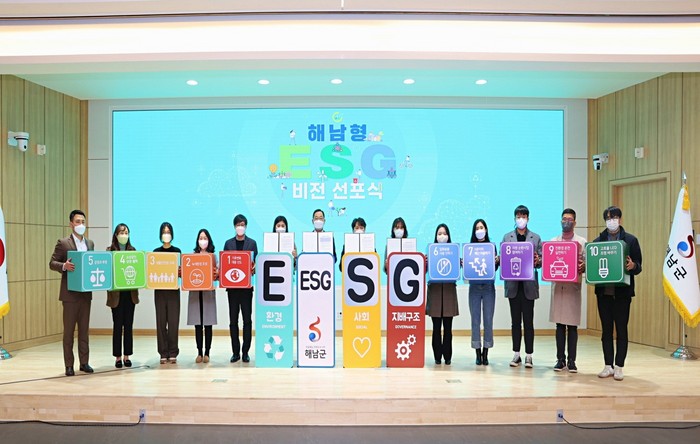 해남군은 3일 2022년 시무식과 함께 해남형 ESG 비전 선포식을 개최했다. 명현관 군수는 신년사를 통해 “친환경(Environment)과 사회적책임(Social), 윤리경영(Governance)을 아우르며 국가적 과제로 떠오르고 있는 ESG 경영을 행정의 영역으로 확장하여 군정의 전 분야에 걸쳐 발전의 성장동력으로 삼겠다”고 천명했다.