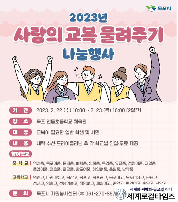 [세계로컬타임즈 김명진 기자] 전남 목포시가 교복 물려주기 행사를 진행한다.