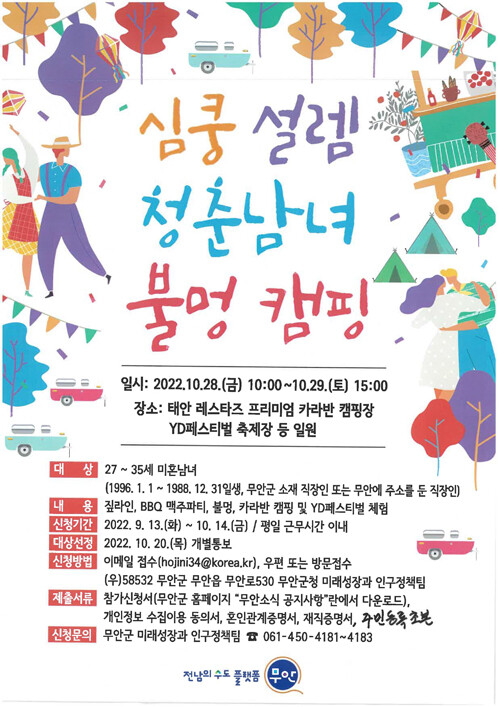 무안군 소재 직장인 또는 무안에 주소를 둔 직장인 27세 이상 35세 이하 청춘 남녀를 대상으로 참가자를 모집한다.