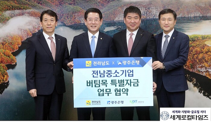 [세계로컬타임즈 김명진 기자] 전라남도가 15일 도청 서재필실에서 ‘중소기업 버팀목 특별자금’ 융자지원 업무협약을 하고 고금리.고환율.고물가 등으로 자금 조달에 어려운 지역 중소기업 금융지원에 나섰다.