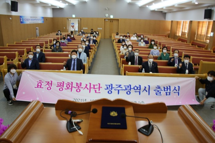 ▲효정평화봉사단 광주광역시 출범식이 14일 광주 통일회관에서 열리고 있다. |