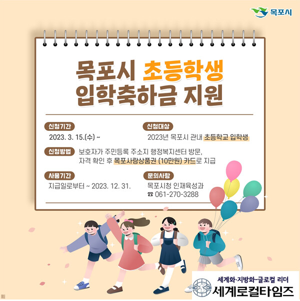 [세계로컬타임즈 김명진 기자] 전남 목포시가 “올해부터 초등학교 입학생 가정에 입학축하금을 지원한다”고 22일 밝혔다.