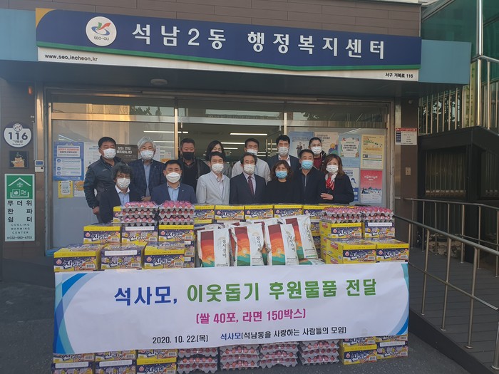 [세계로컬타임즈 유영재 기자] 석남동을 사랑하는 사람들의 모임(석사모)에서는 코로나19 확산이 장기화함에 따라 결식이 우려되는 취약계층을 위해 300만 원 상당의 쌀 40포와 라면 150박스를 전달했다.