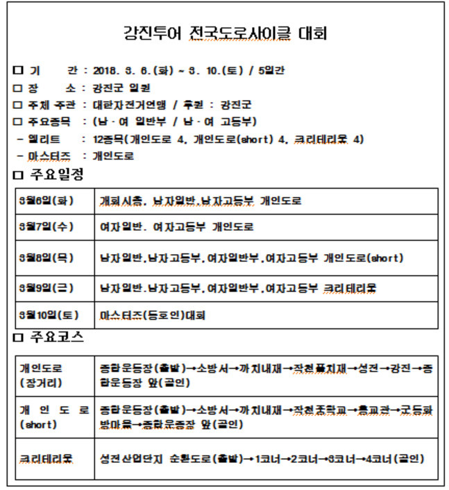 선수들은 강진종합운동장 앞을 출발해 158㎞에 이르는 개인 도로경기 두 번과 넷째 날 강진 성전산업단지에서 실시하는 크리테리움 경기까지 총 세 차례 레이스를 펼친다.