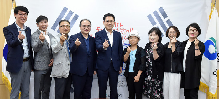 | ▲ 박남춘(가운데) 인천시장은 사회복지시설 종사자들과 소통 간담회 후 손가락 하트를 보이고 있다. (사진=인천시 제공) |