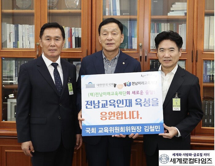 [세계로컬타임즈 김명진 기자] 김철민 국회 교육위원위원회 위원장이 지난 18일 (재)전남미래교육재단(이사장 김대중)에 소정의 장학금과 응원의 메시지를 전달했다.
