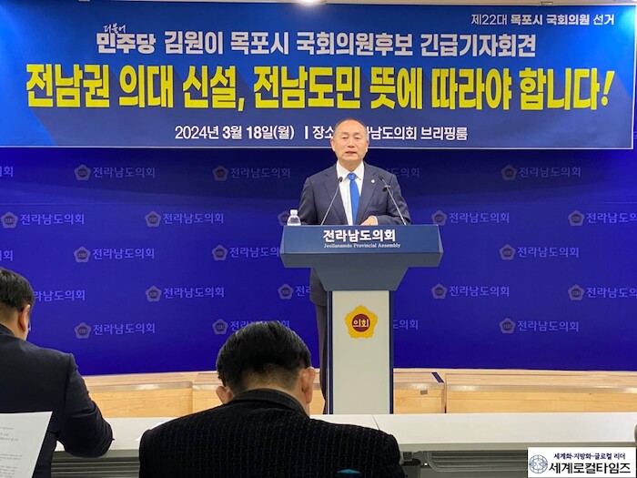 [세계로컬타임즈 김명진 기자] 김원이 더불어민주당 목포시 국회의원 후보는 18일 오후 전남도의회브리핑룸에서 긴급기자회견을 개최하고, 목포의대 신설이 포함된 목포대·순천대 통합의대 신설에 동의하며 전라남도 의대 신설은 전남도민의 뜻에 따라 진행돼야 한다는 입장을 발표했다.