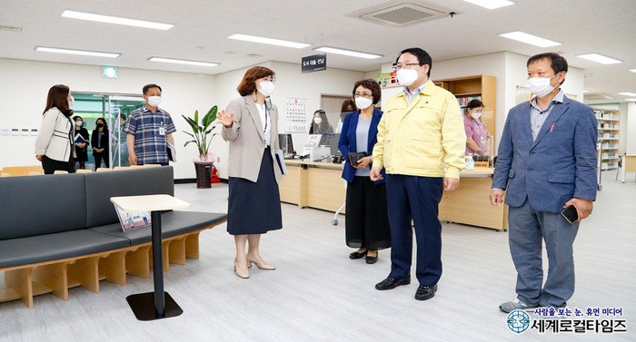 정 시장은 운영 현황을 보고받은 후 1층 어린이 자료실과 북카페, 2층 종합정보화자료실 등 시설 곳곳을 둘러보며 도서관을 찾은 이용자들의 의견을 청취하기도 했다.