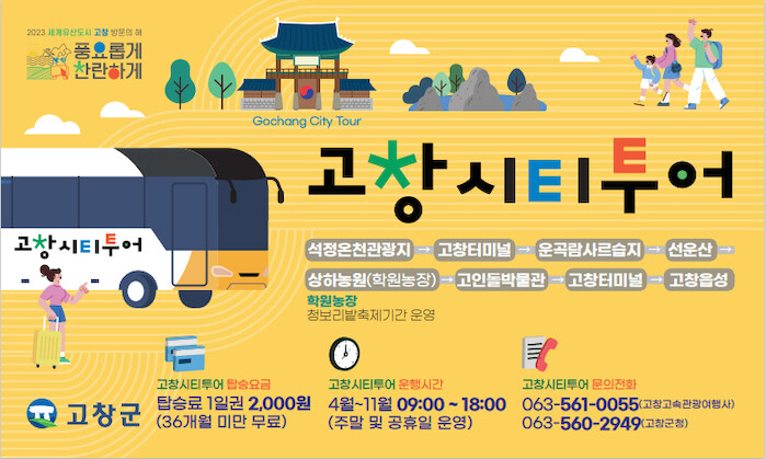고창군 나윤옥 관광산업과 팀장은 “2023 세계유산도시 고창 방문의 해를 맞아 편리하게 고창을 찾는 여행객들 위해 고창 시티투어 버스 운영에 만전을 기하겠다”며 “고창의 다채로운 행사, 축제와 관광지를 홍보해 더 많은 여행객이 고창을 찾을 수 있도록 노력하겠다”고 전했다.