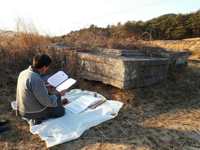 | ▲ 경주 문화재제자리찾기운동본부 김윤근 대표가 이거사지에서 고유를 하고있다.(사진=경주시 제공) |