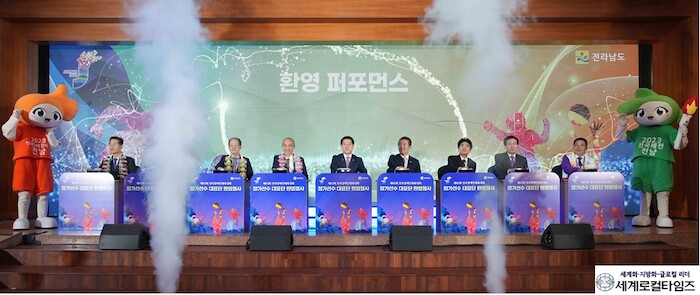 행사는 전남도립국악단의 환영 공연, 환영사, 축사, 인사 말씀, 꽃목걸이 전달, 성공개최 퍼포먼스 순으로 진행됐다.
