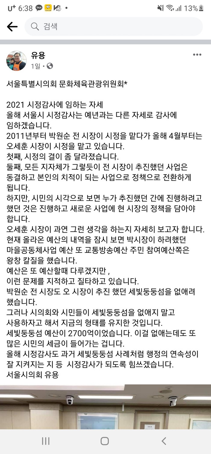 유용 의원은 "올해 시정감사도 과거 세빛둥둥섬 사례처럼 행정의 연속성이 잘 지켜지는 지 보여주는 시정감사가 되도록 힘쓰겠습니다"고 다짐했다.