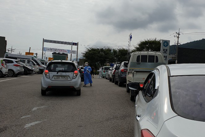 | ▲ 30일 강화군보건소에 검체검사 대기열이 길게 늘어서 있다.(사진=강화군 제공) |