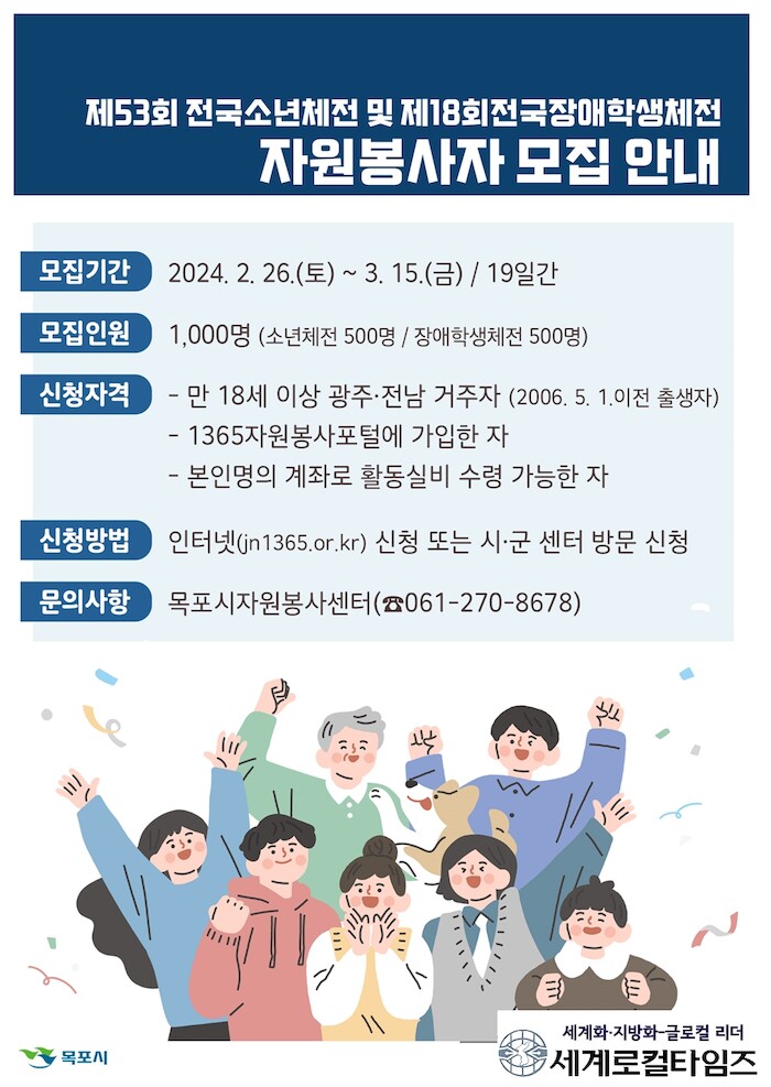 [세계로컬타임즈 김명진 기자] 목포시가 제18회 전국장애학생체전·제53회 전국소년체전을 성공적으로 이끌어 갈 자원봉사자 1,000명을 모집한다.