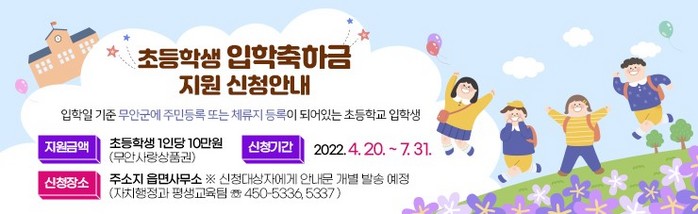 지원대상은 입학일 기준으로 무안군에 주민등록 또는 체류지 등록이 돼있는 초등학교 입학생으로, 이들에게는 1인 10만원 상당의 무안사랑상품권이 지급된다.