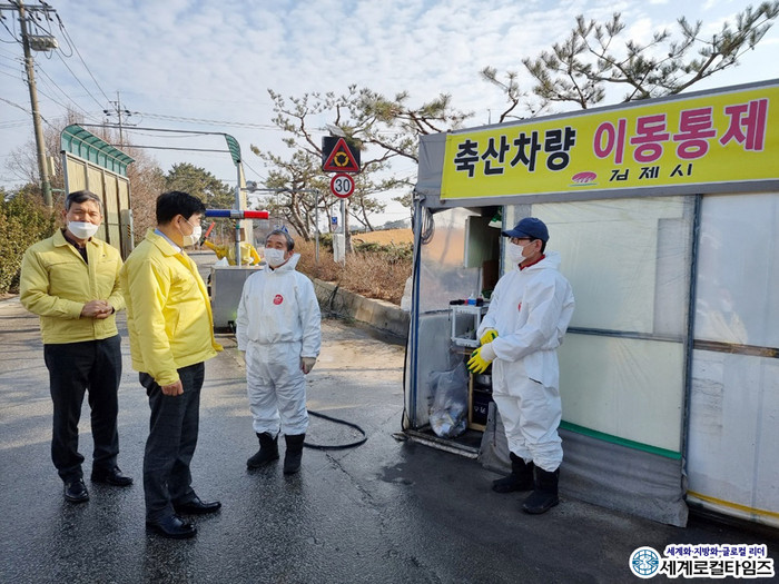 [세계로컬타임즈 조주연 기자] 전북 김제시 김광수 부시장이 27일, 밀집단지 ‘거점소독시설 및 통제소독초소’를 방문해 조류인플루엔자(이하 AI) 확산 차단을 위한 차량 및 대인 소독 실시상황과 소독시설의 정상 작동 여부 등 방역상황을 점검하고 방역 현장 근무자들을 격려했다.